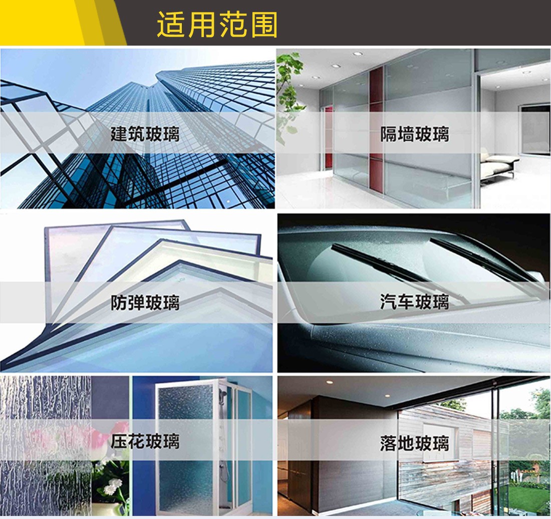 使用范圍:所有汽車擋風(fēng)玻璃、玻璃門窗、鏡子及玻璃用具,本品還可以用于玻璃幕墻等大型玻璃設(shè)施用建筑。