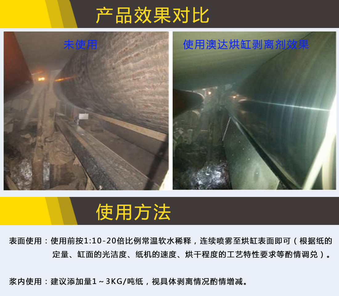 1、有效改善各種紙在生產中粘缸和掉紙粉等現象; 2、提高紙纖維柔軟性、平滑性,使紙幅與烘缸表面的摩擦減少、賦予紙品特殊的光亮性、紙頁無油斑; 3、不僅解決粘缸現象,而且還保持干網的清潔; 4、任意比例水稀釋不分層、不破乳、分散性好,不堵噴頭; 5、因為非離子性,與其它化學品配伍性好; 6、用量少、操作方便、剝離效果好。
